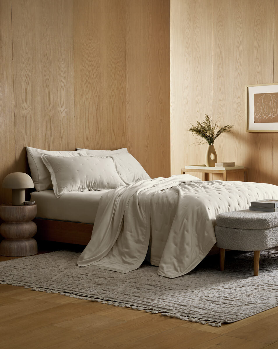 Our bamboo quilts are crafted from viscose made from bamboo that drapes gently across the bed and stays cool to the touch. They’re comfortable on warmer nights and just as useful layered in cooler months when you want something between a sheet and a full comforter.